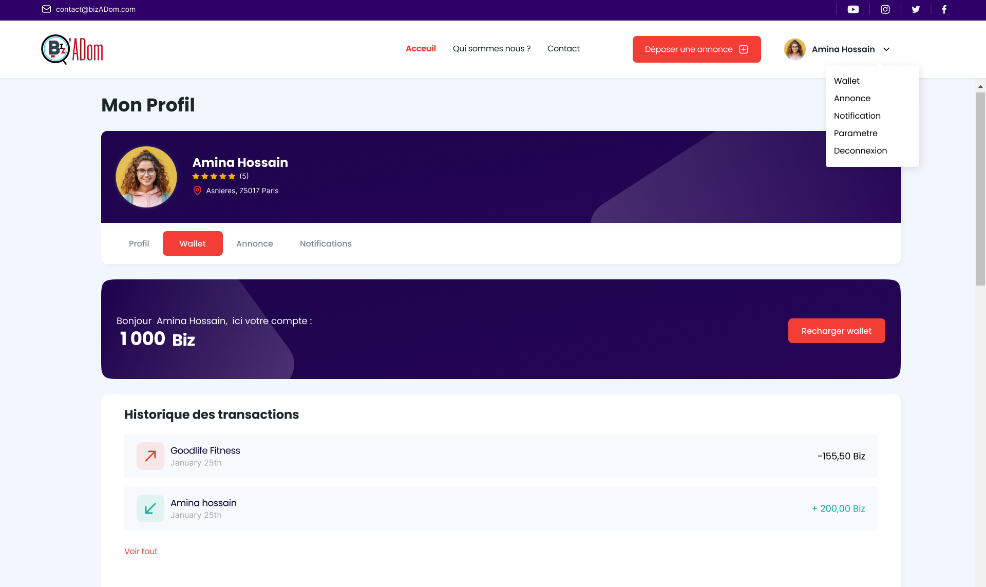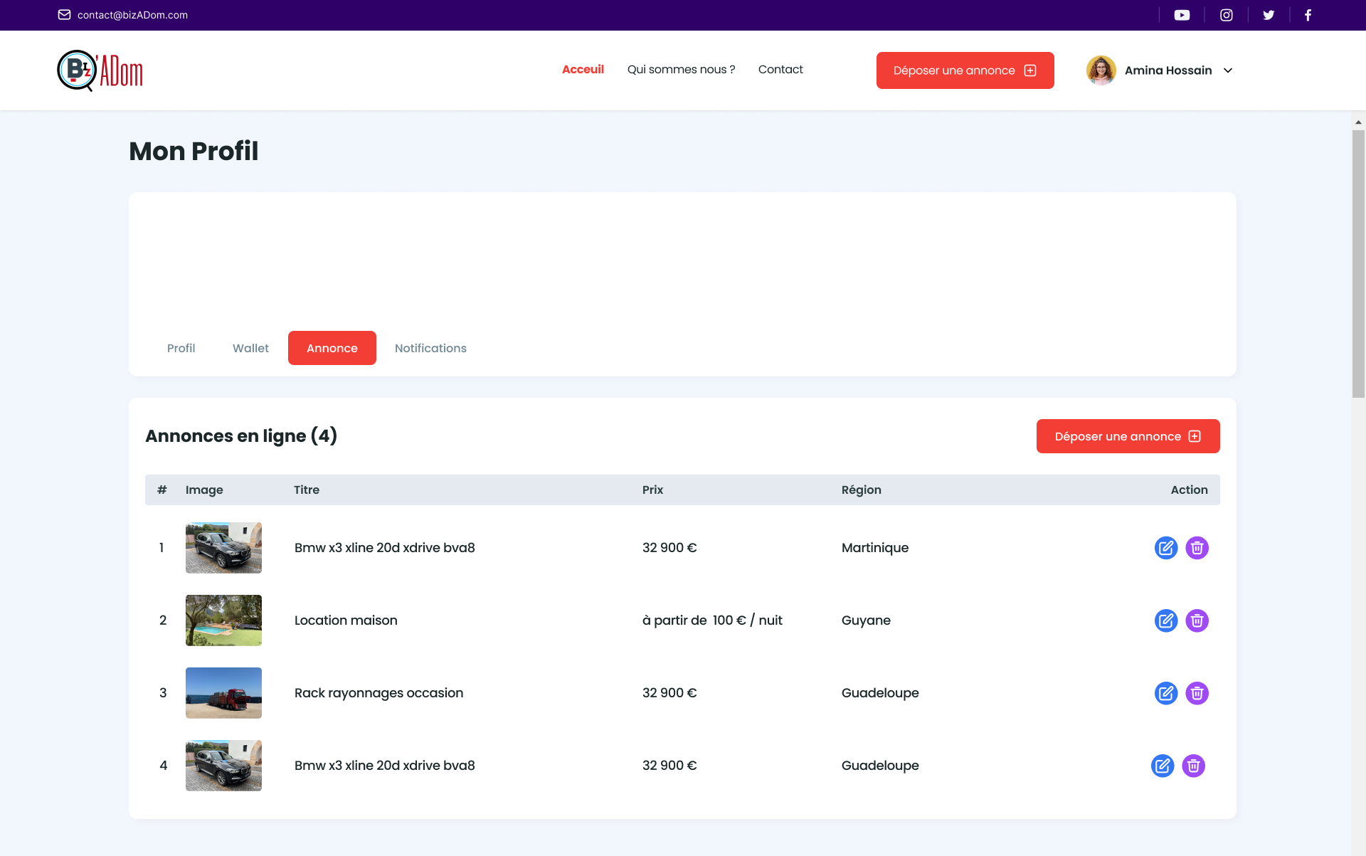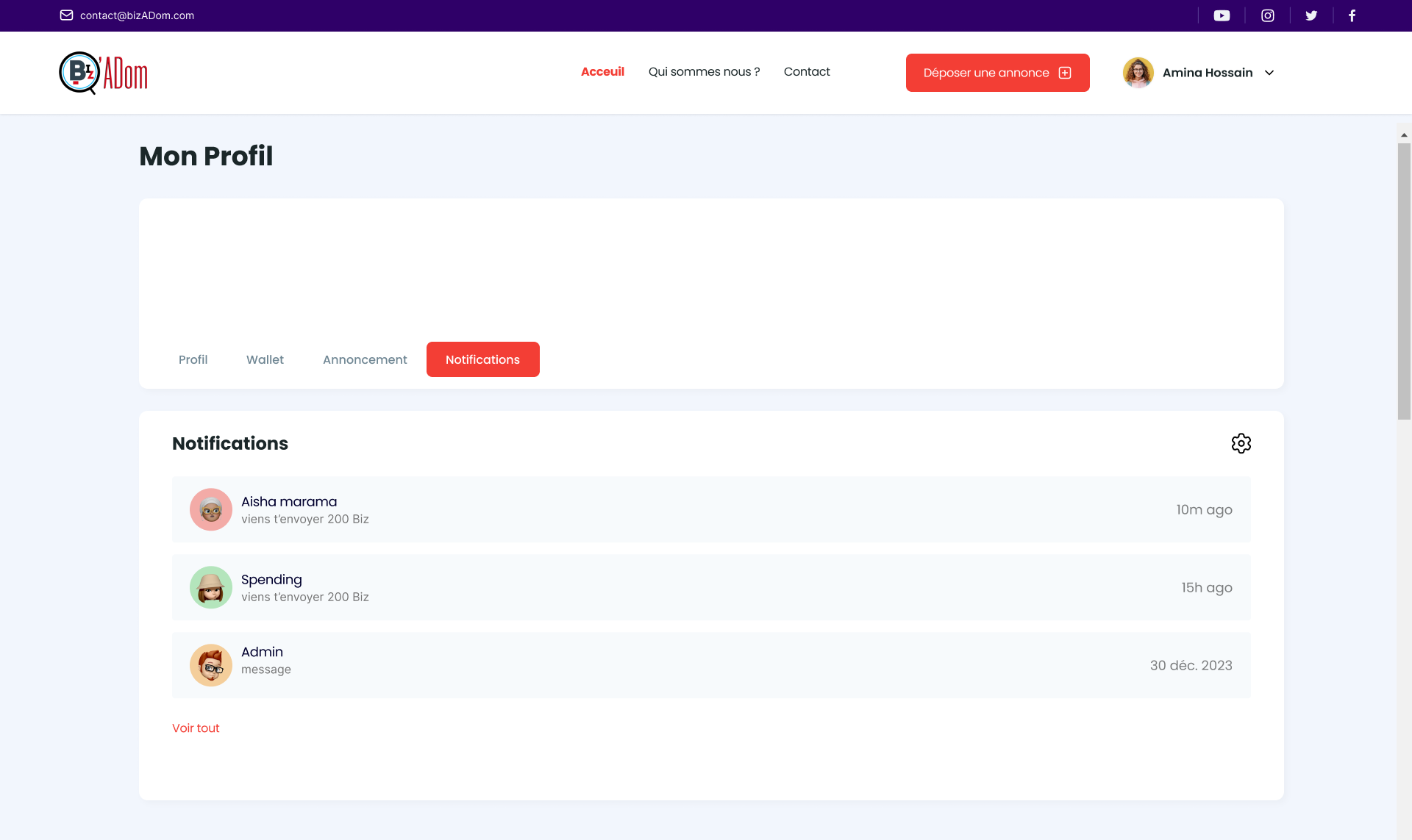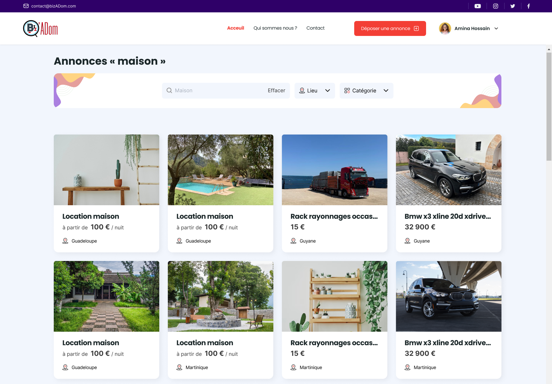 BizADom est une plateforme web dédiée à la mise en relation et à l’entraide commerciale entre entreprises et particuliers. La solution permet aux utilisateurs de s’inscrire, de publier des annonces et d’accéder à différents services via des formules d’adhésion adaptées, favorisant la visibilité et les opportunités d’affaires au sein de la communauté.