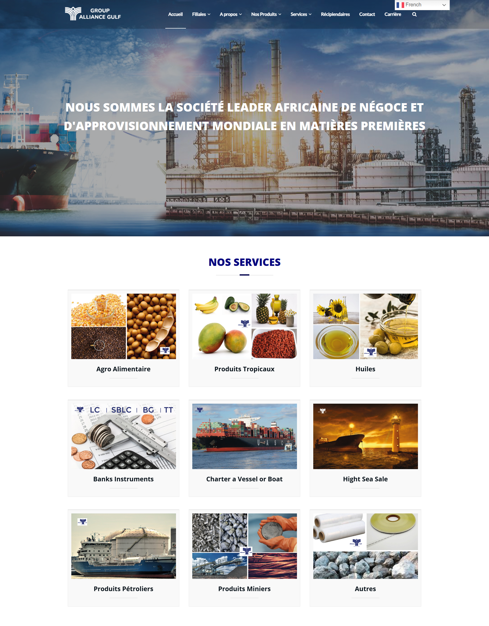 Le site du Group Alliance Gulf présente l’activité d’une entreprise de négoce et d’approvisionnement en matières premières, mettant en avant son réseau mondial de fournisseurs et son expertise en commerce international.